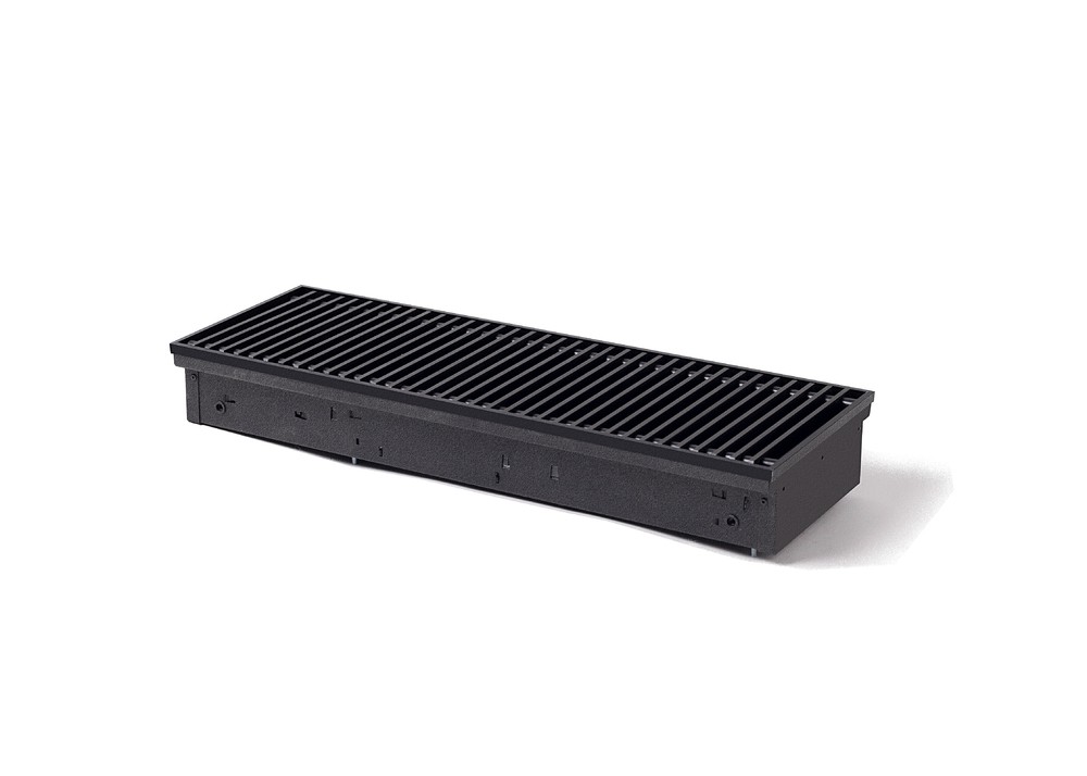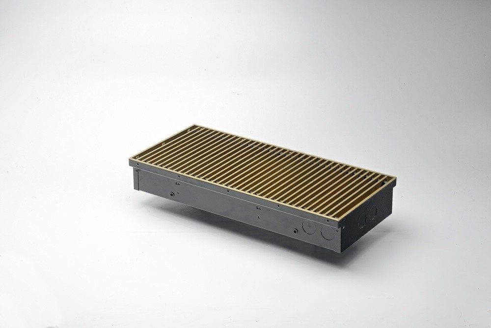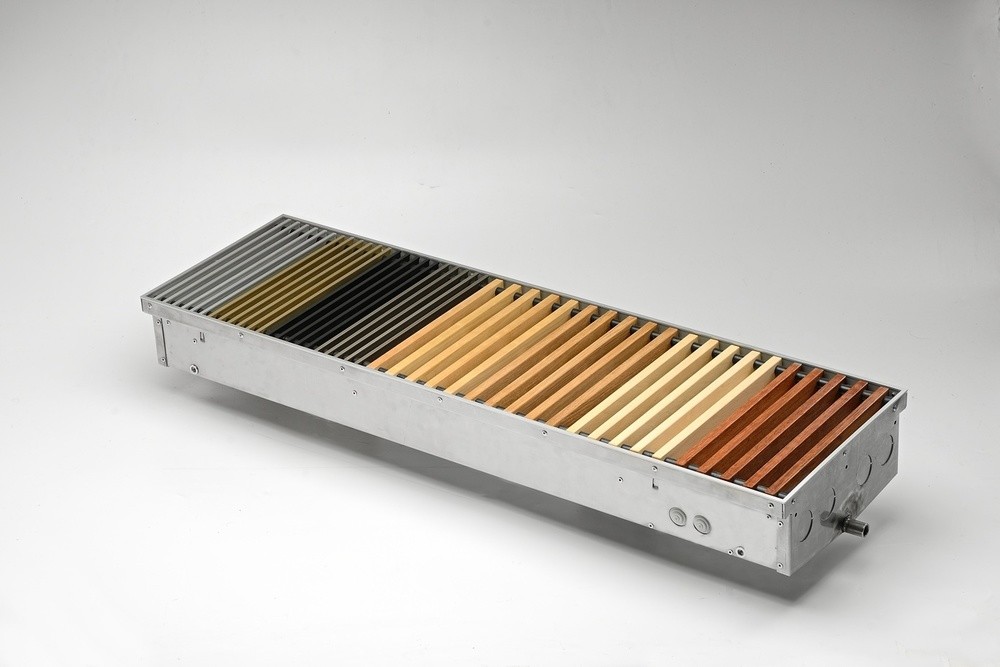 Конвектор "Гольфстрим" представляет собой стойкий к коррозии теплообменник, состоящий из медной трубы и алюминевых пластин оребрения. Короб из оцинкованной стали окрашен методом порошкового напыления. Сверху конвектор закрыт декоративной решеткой, выполненной из дерева, алюминия или стали. Возможно изготовление прибора под заданный радиус и с угловыми элементами. Конвектор укомплектован клапаном воздухоудаления.