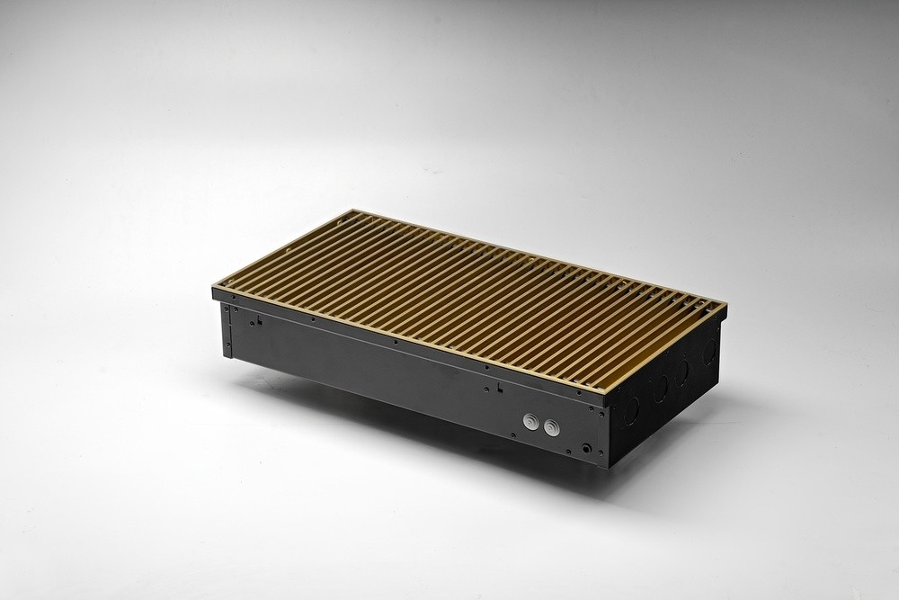Конвектор "Гольфстрим" представляет собой стойкий к коррозии теплообменник, состоящий из медной трубы и алюминевых пластин оребрения. Короб из оцинкованной стали окрашен методом порошкового напыления. Сверху конвектор закрыт декоративной решеткой, выполненной из дерева, алюминия или стали. Возможно изготовление прибора под заданный радиус и с угловыми элементами. Конвектор укомплектован клапаном воздухоудаления.