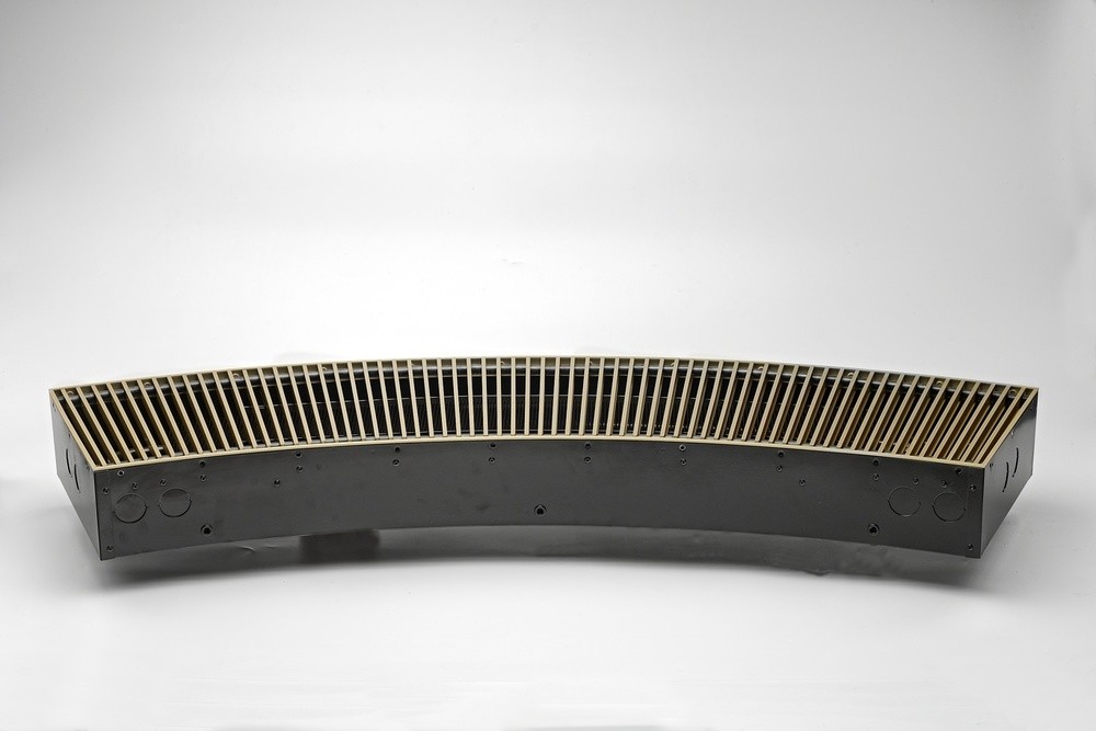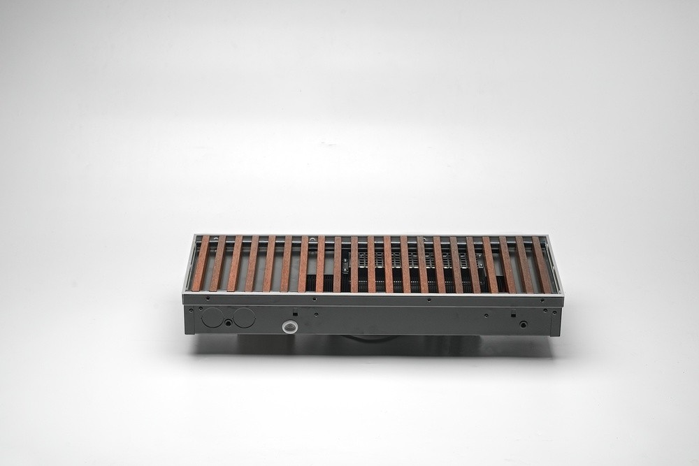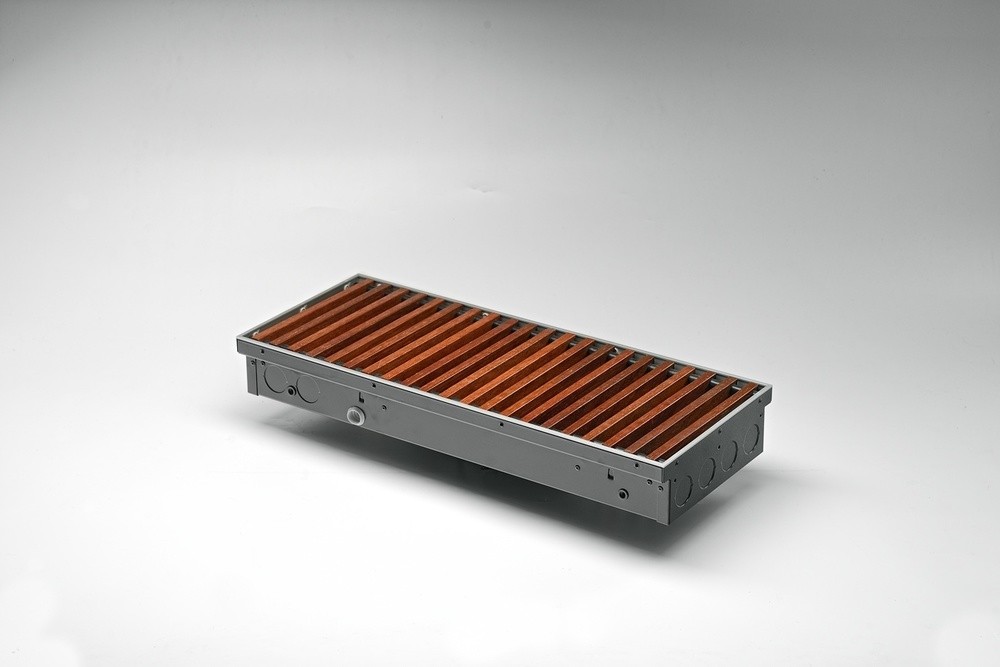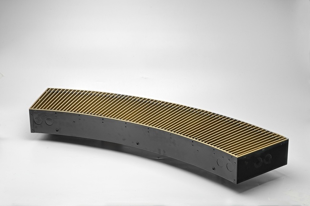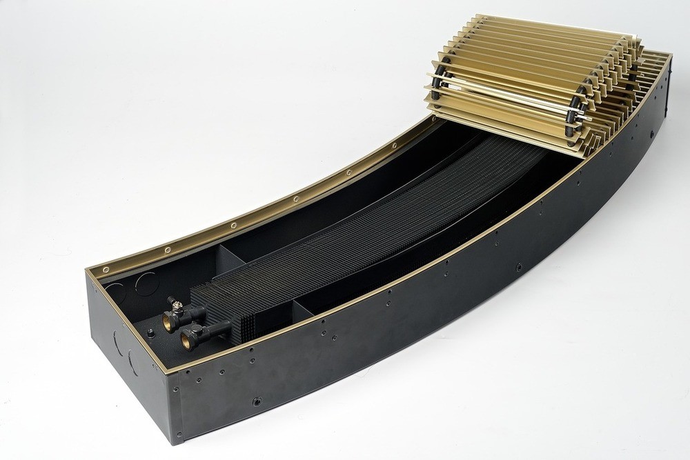 Конвектор "Гольфстрим" представляет собой стойкий к коррозии теплообменник, состоящий из медной трубы и алюминевых пластин оребрения. Короб из оцинкованной стали окрашен методом порошкового напыления. Сверху конвектор закрыт декоративной решеткой, выполненной из дерева, алюминия или стали. Возможно изготовление прибора под заданный радиус и с угловыми элементами. Конвектор укомплектован клапаном воздухоудаления.