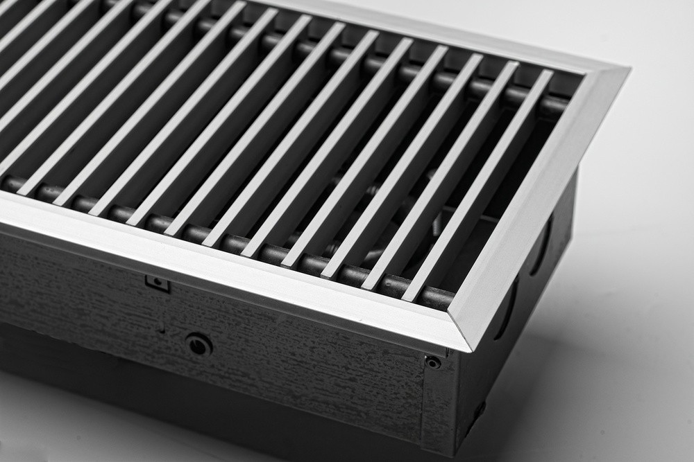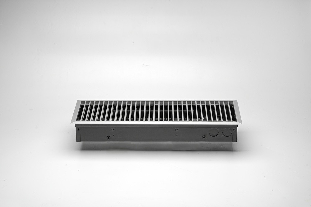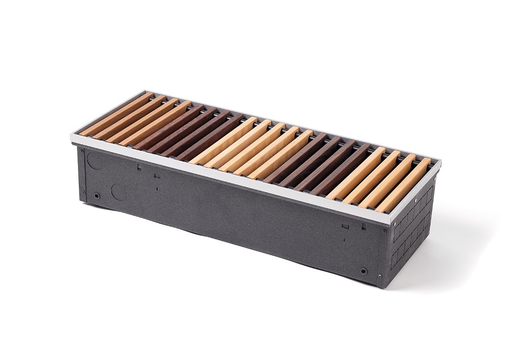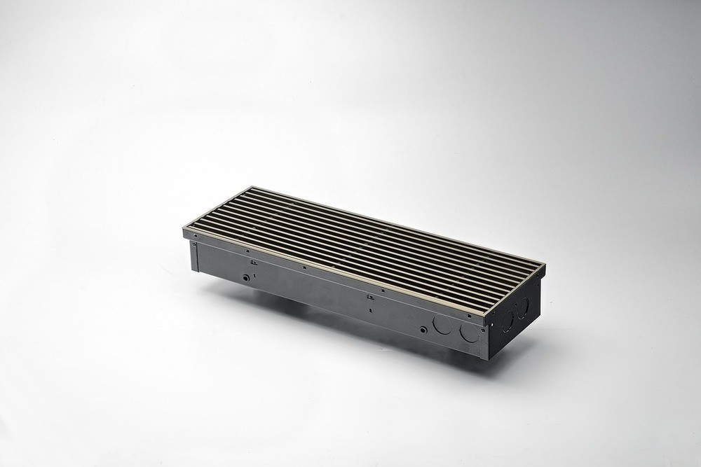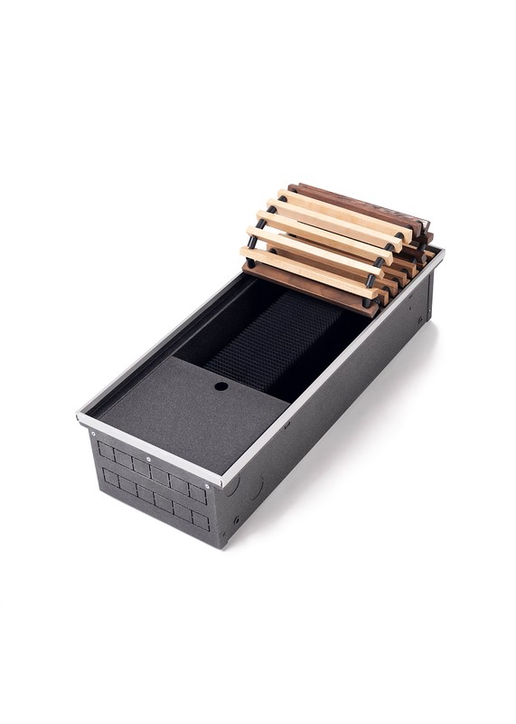 Конвектор "Гольфстрим" представляет собой стойкий к коррозии теплообменник, состоящий из медной трубы и алюминевых пластин оребрения. Короб из оцинкованной стали окрашен методом порошкового напыления. Сверху конвектор закрыт декоративной решеткой, выполненной из дерева, алюминия или стали. Возможно изготовление прибора под заданный радиус и с угловыми элементами. Конвектор укомплектован клапаном воздухоудаления.